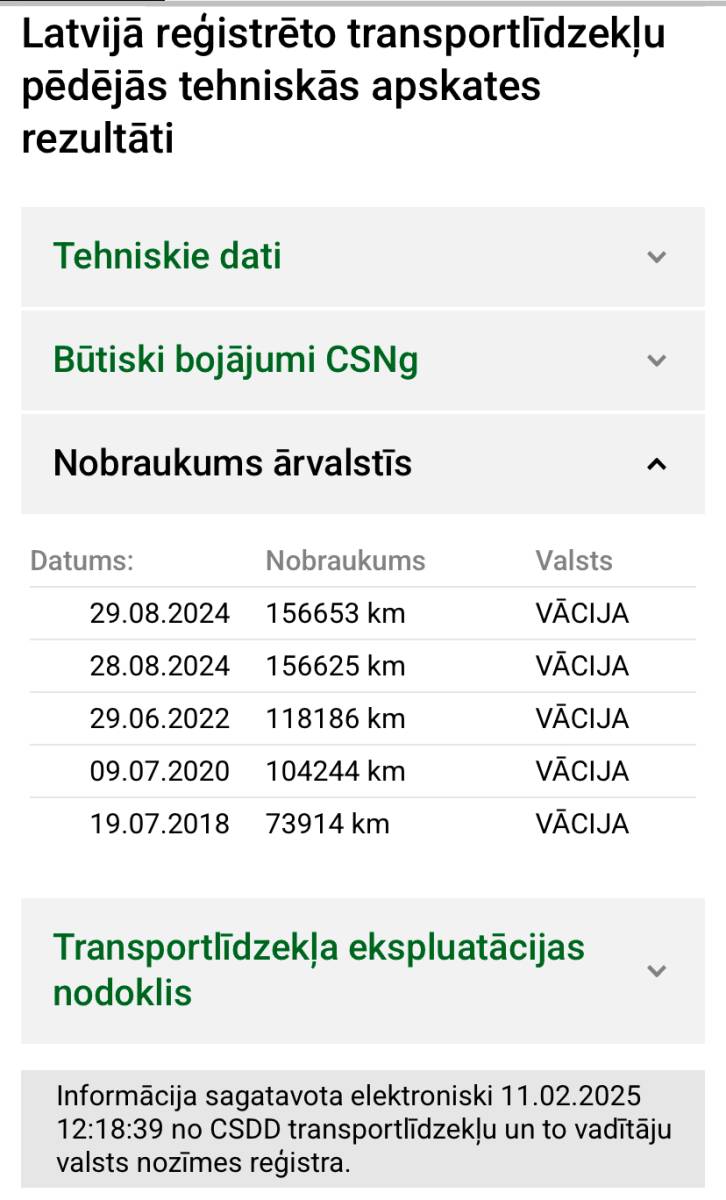 Pēdejā apkope veikta pie:161448km (2.12.2024) Vasaras un ziemas riepu komplekts.